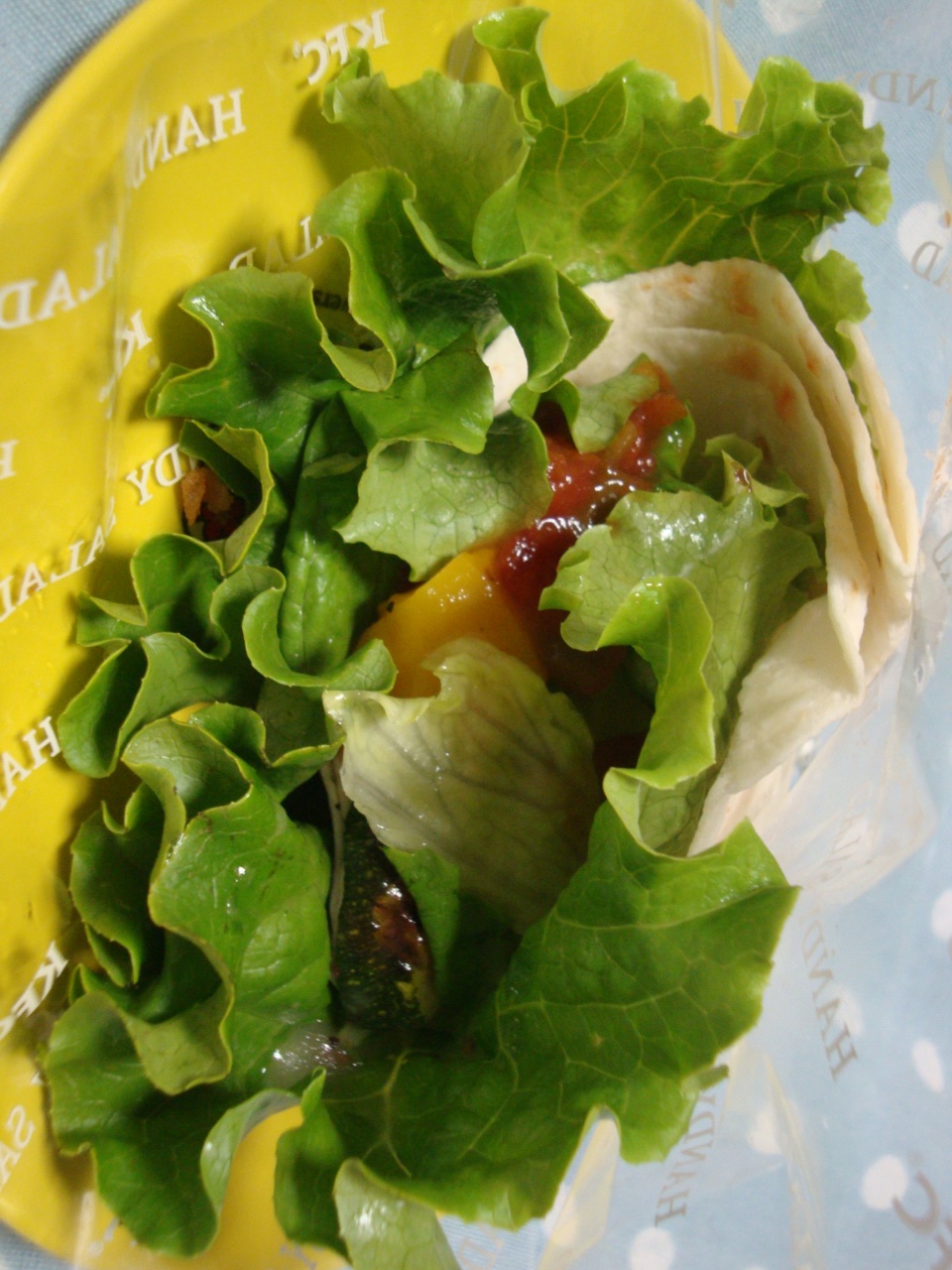 シャキシャキのレタスとグリーンカール、赤と黄色のパプリカに、ズッキーニ。いろどり豊かな5種の野菜を、トルティーヤでハンディにまとめました。特製サルサソースの爽やかな味わいは、チキンとも相性バツグン!