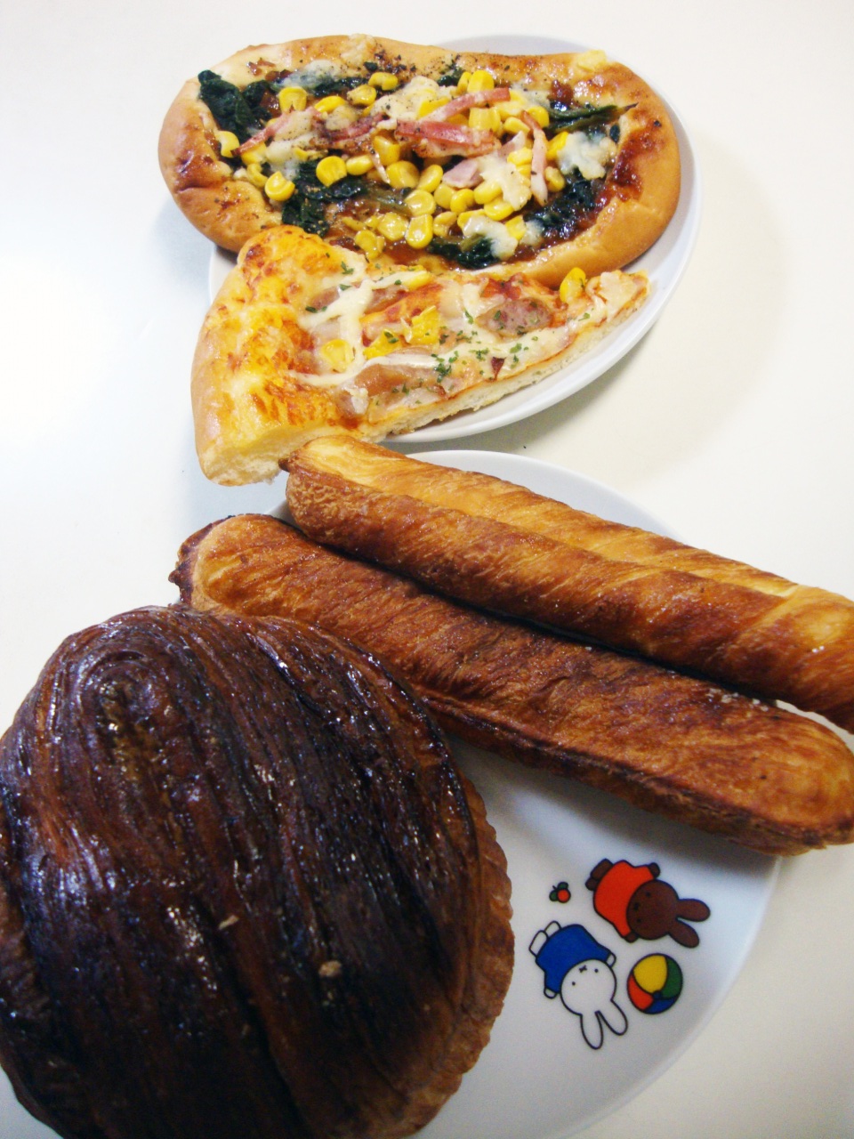 ツインクル、チェルキー2個、ピザパン、コーンと野菜の甘いソースのパン。