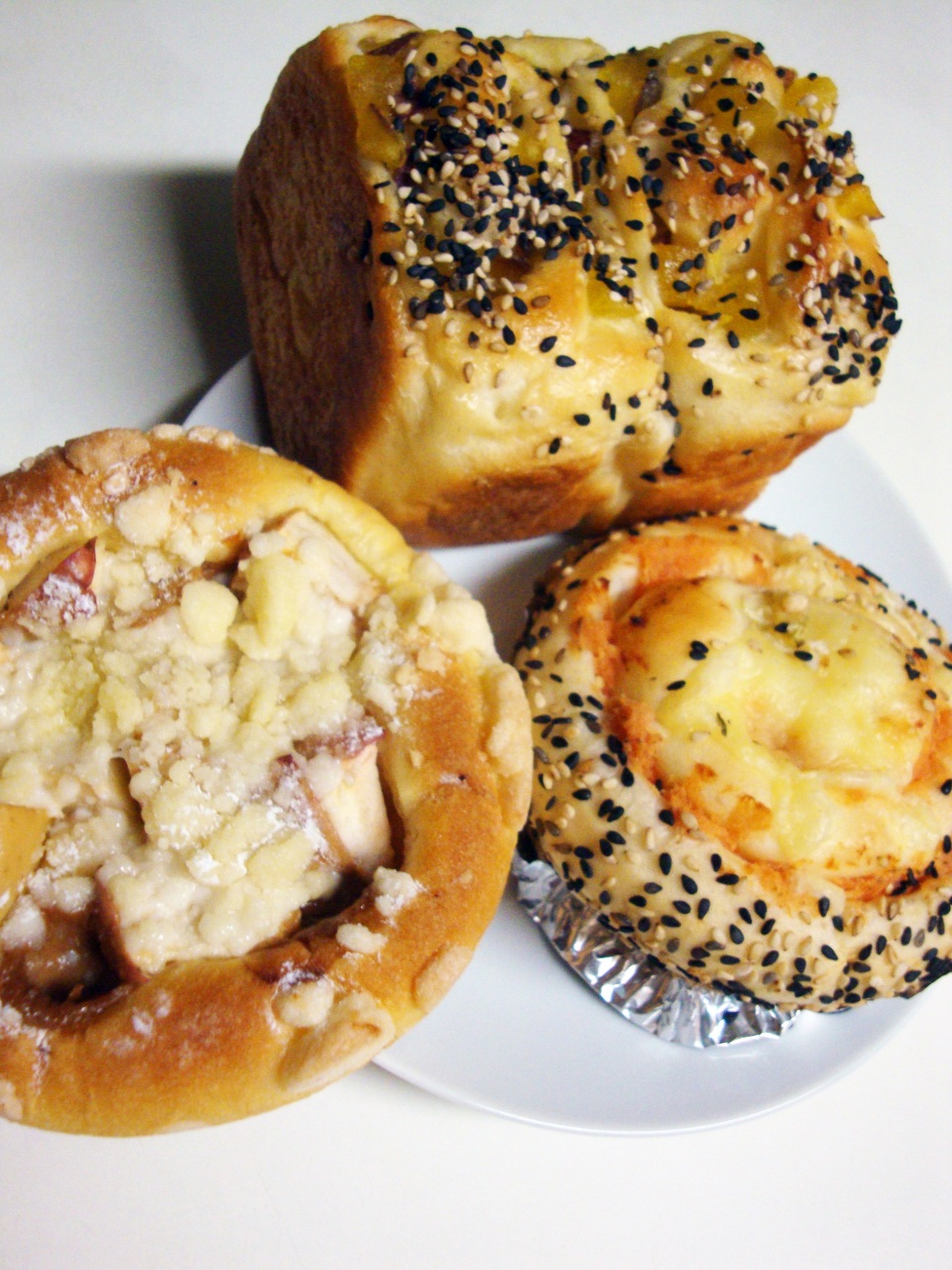 さつまいもとゴマのパン、鮭とゴマのパン、ポム・ド・クーヘン。