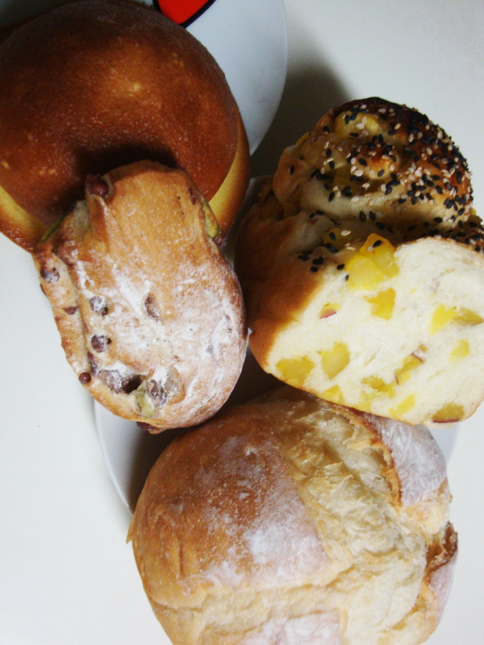 ルンド・グロース、鳴門金時ブレッド、小豆入りのパン、丸いパン。