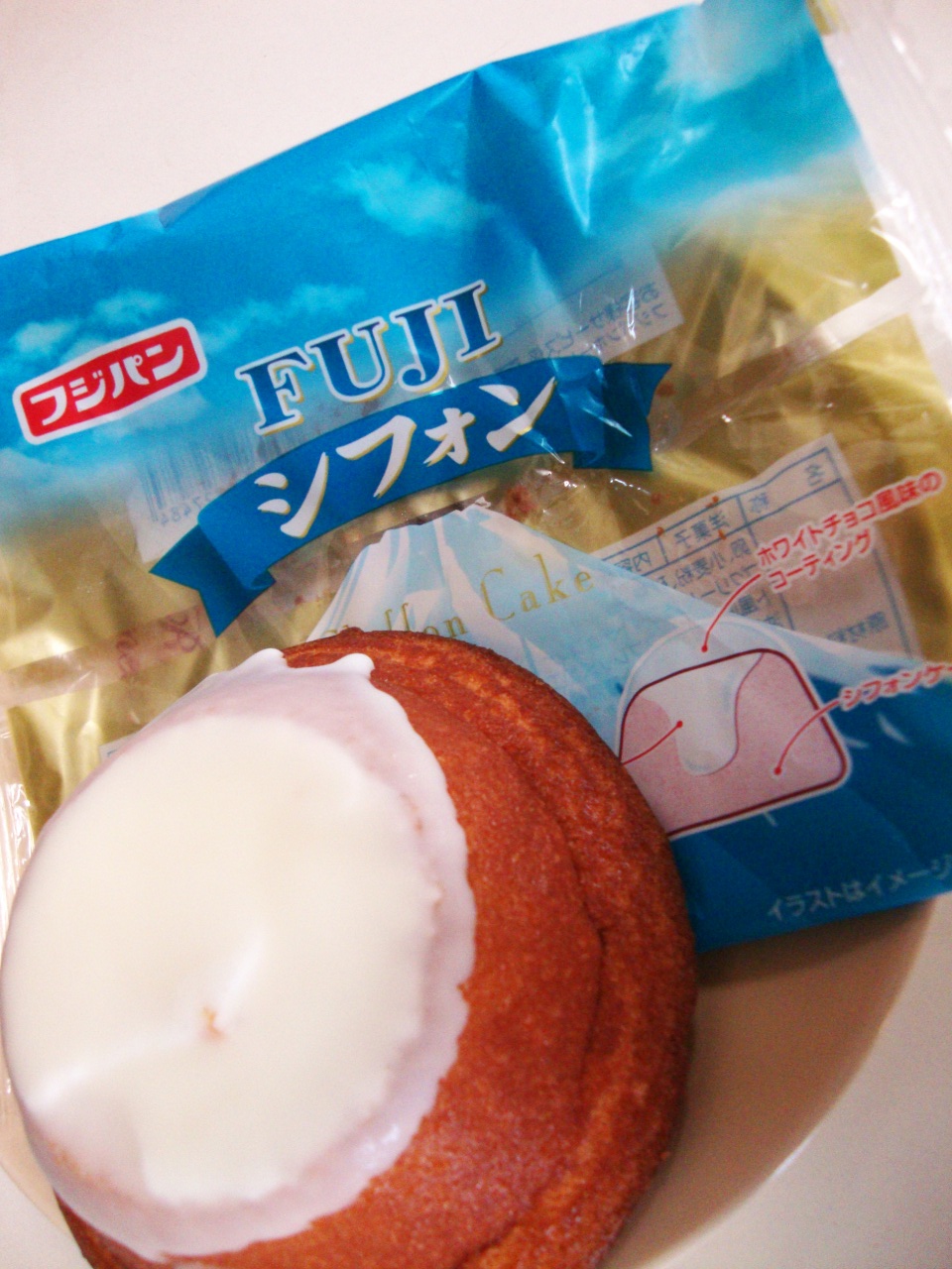祝 富士山 世界文化遺産登録記念商品。ふんわりしたシフォンケーキの中にホイップクリームを入れ、ホワイトチョコ風味コーティングで仕上げました。