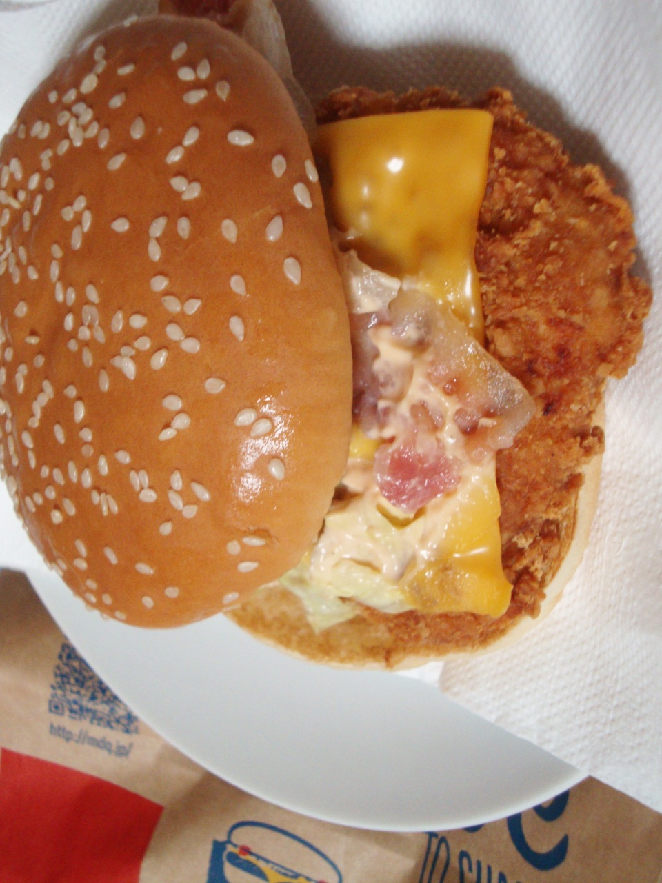 チキンフィレオにスモーキーなベーコン二枚と、コクのあるチェダーチーズ、シャキシャキした食感のオニオンを追加したデラックスな味わい。