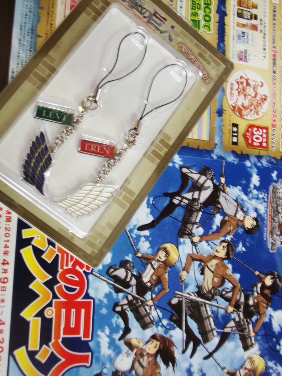 翼がデザインのリヴァイさんとエレンのペアストラップ。
