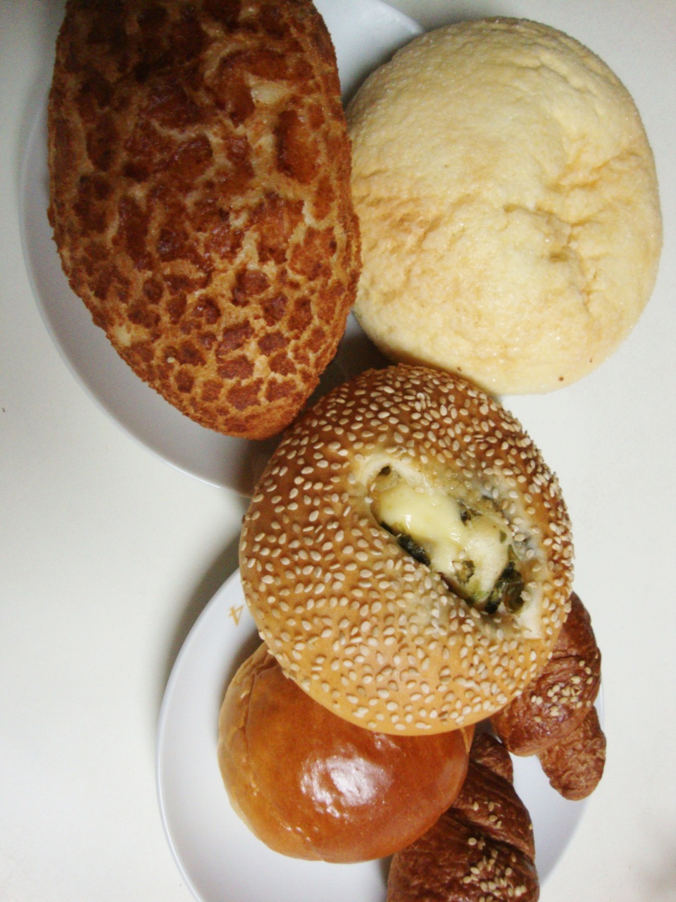 クワトロチーズフォンデュ、メープルメロンパン、角煮まん、牛乳仕込みのバターロ−ル、ミニクロワッサンチョコ ×2。