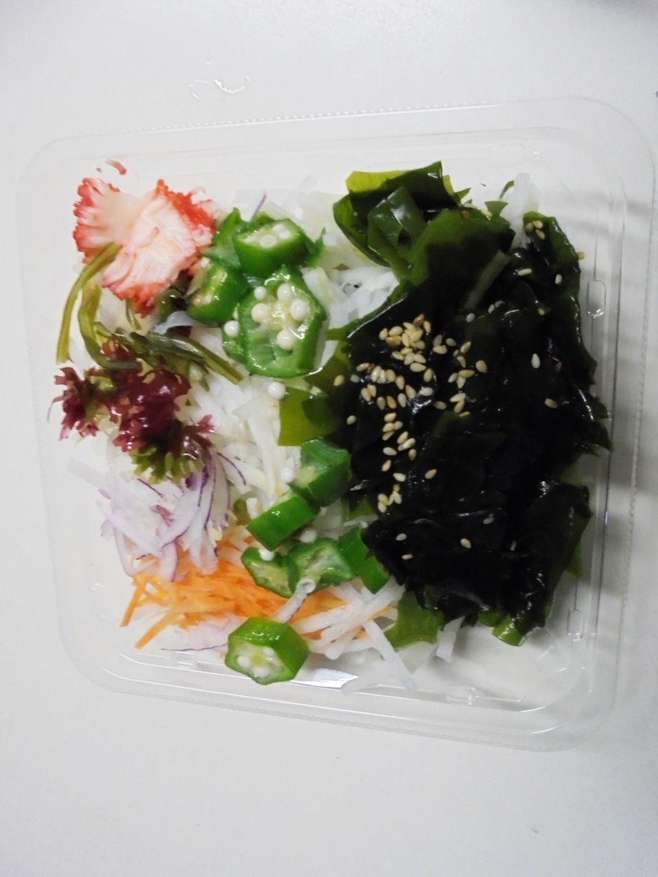 わかめ・オクラ・かえでのり・茎わかめをふんだんに使用したボリュームのあるサラダです。ベースには春雨・茎わかめ・オクラスライスを合わせたネバネバサラダを盛り付けています。