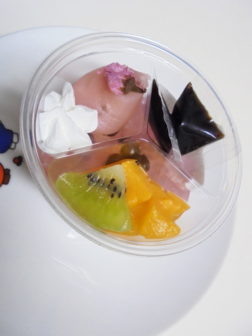 ほんのり桜色の角切りさくら寒天に、桜あんとフルーツをあわせ召し上がれ。 桜の塩漬けでアクセントをつけました。