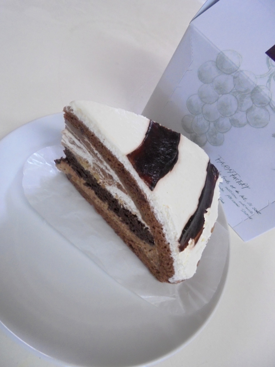 チョコチップを入れて食感にアクセントをつけたスポンジ入りチョコクリームとホワイトチョコをかけたパイクラムと生クリームを入れてマーブル模様にしたチョコレートムースでクラシックショコラをサンドし、チョコスポンジと生クリームで覆いました。