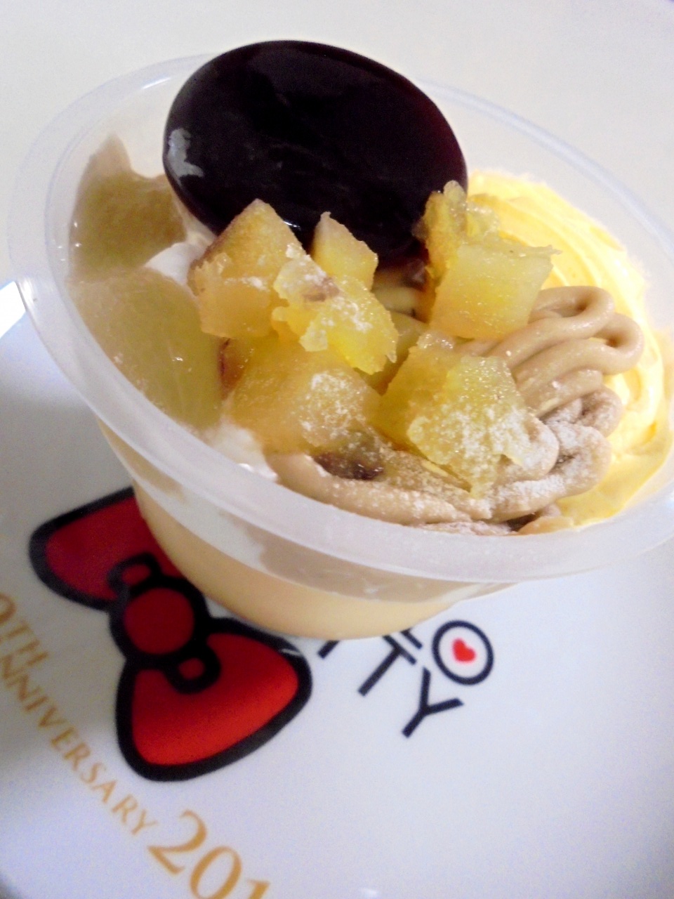じっくりと焼き上げたカスタードプリンに、ホイップクリームをたっぷりトッピングし、かぼちゃホイップ、渋皮モンブランクリーム、角切りさつまいも甘露煮、ぶどう、プチプリンで仕上げました。