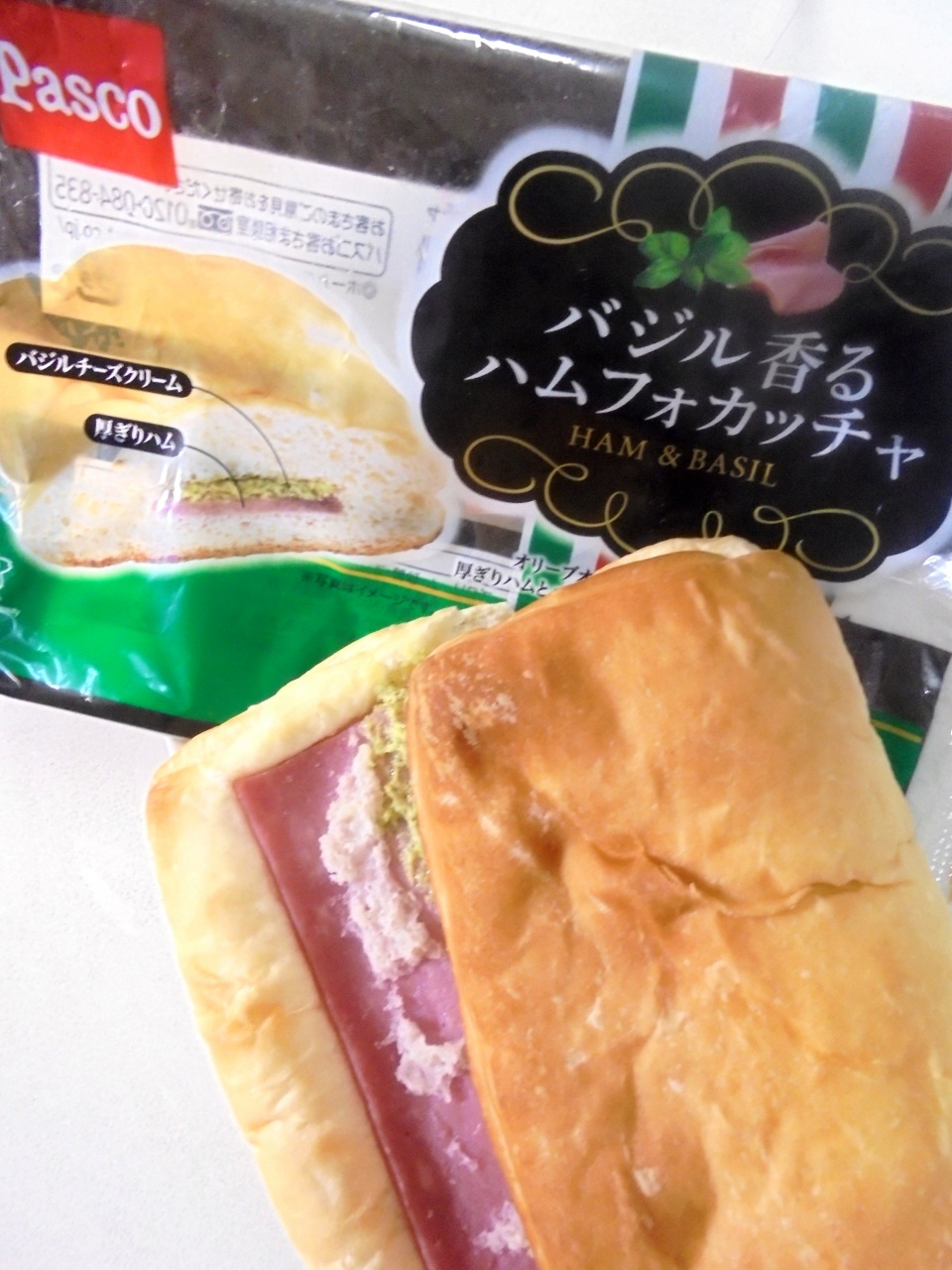 オリーブオイルを練り込んだパンに、厚ぎりハムとバジルチーズクリームをはさみました。
