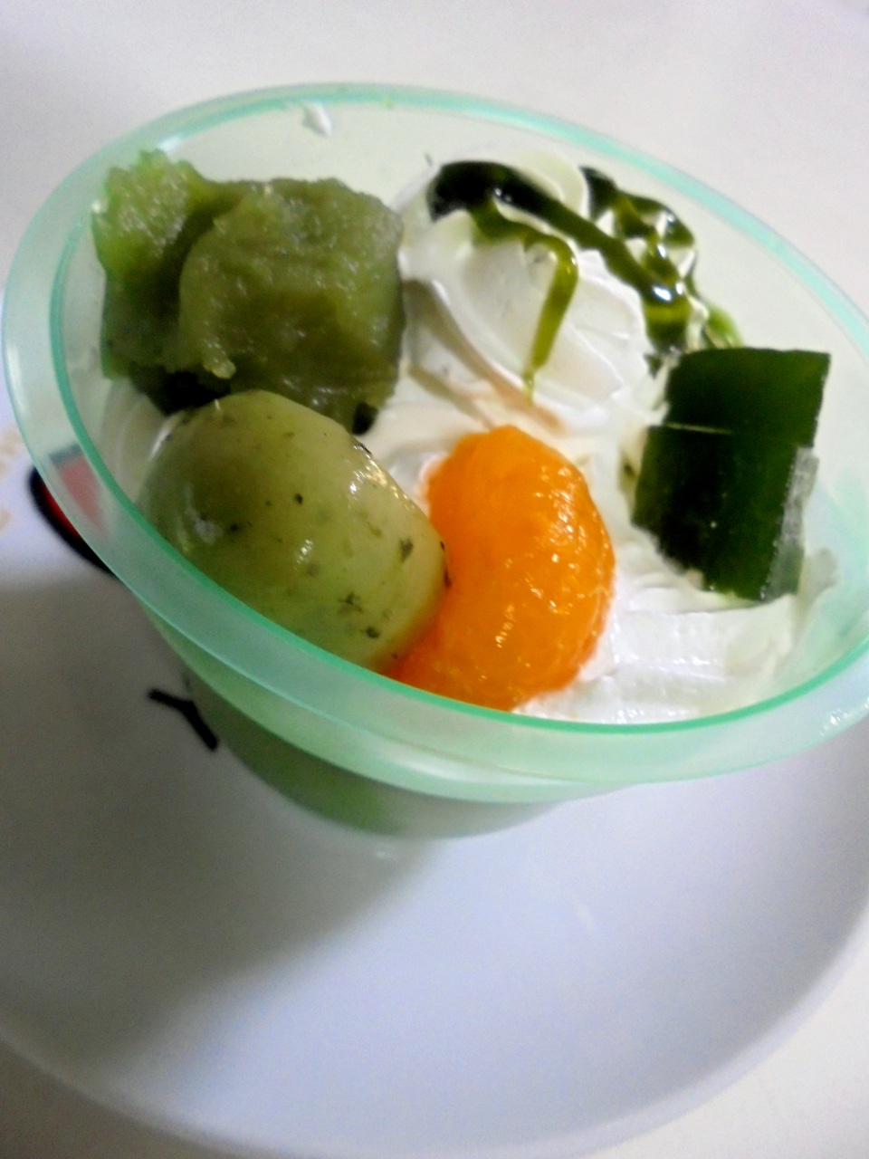宇治抹茶を使用し、なめらかな食感に焼き上げた抹茶プリンに、ホイップクリームをたっぷり絞り、抹茶あん・抹茶ソース・抹茶寒天・よもぎ白玉・みかんをトッピングしました。