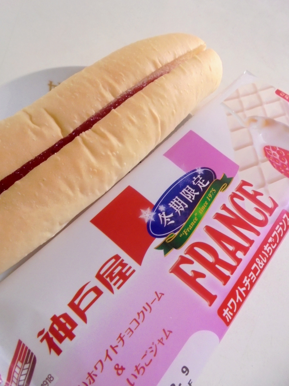 ソフトなフランス生地に、ホワイトチョコ味クリームと、とちおとめいちごジャムをサンドしました。